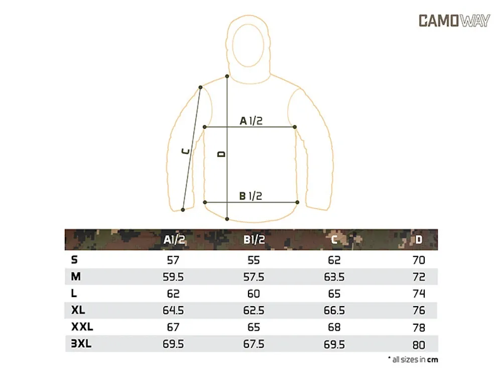 CamoWAY jopel on ka kapuuts, mida saab reguleerida nööridega. Varrukad on otstest veidi kitsenevad ja varustatud pehme kummiga, et need randme ümber hästi istuksid. Disain koosneb tumepruunist värvist, mis on kombineeritud digitaalse kamo mustriga, mida täiendab stiilne heledas toonis CamoWAY logo.